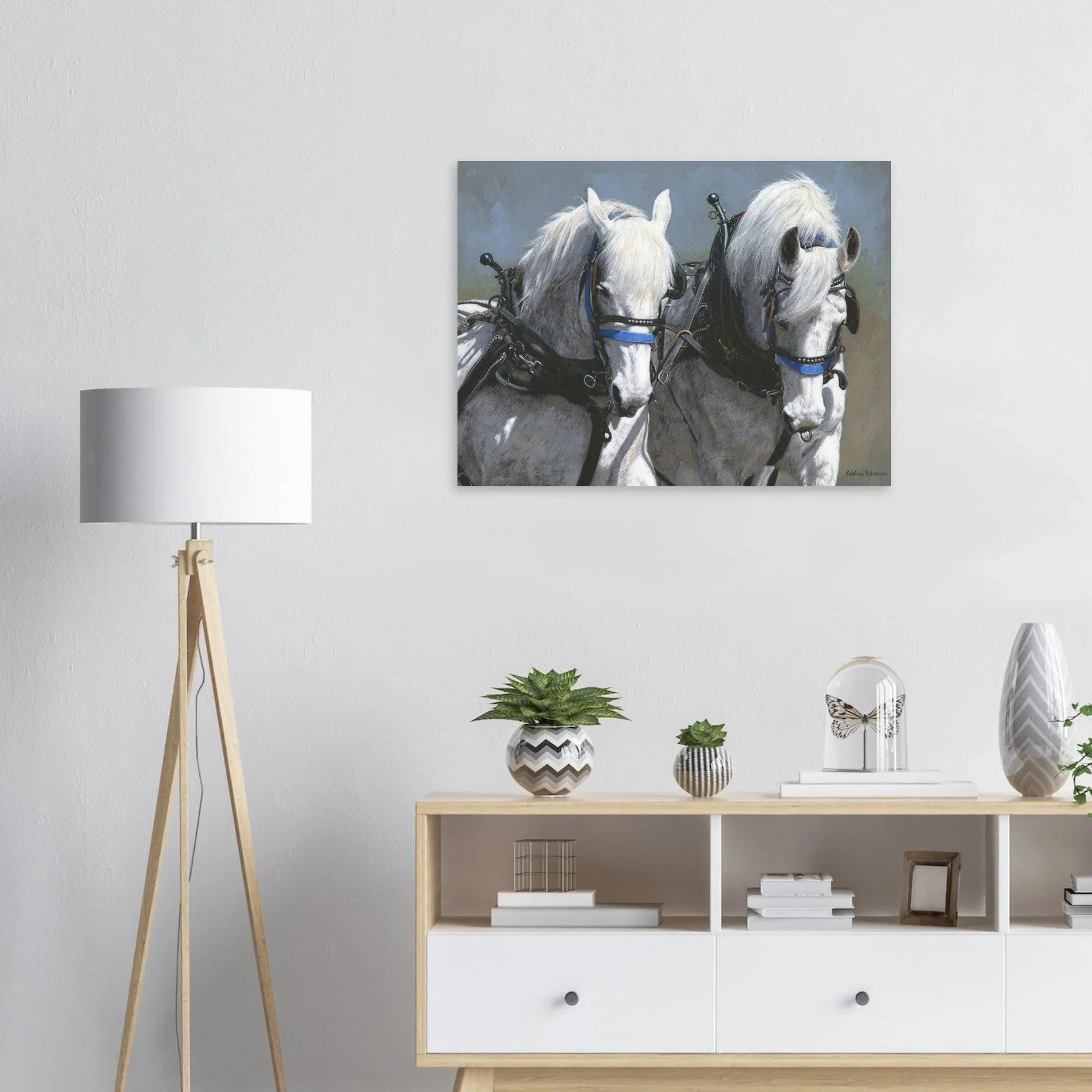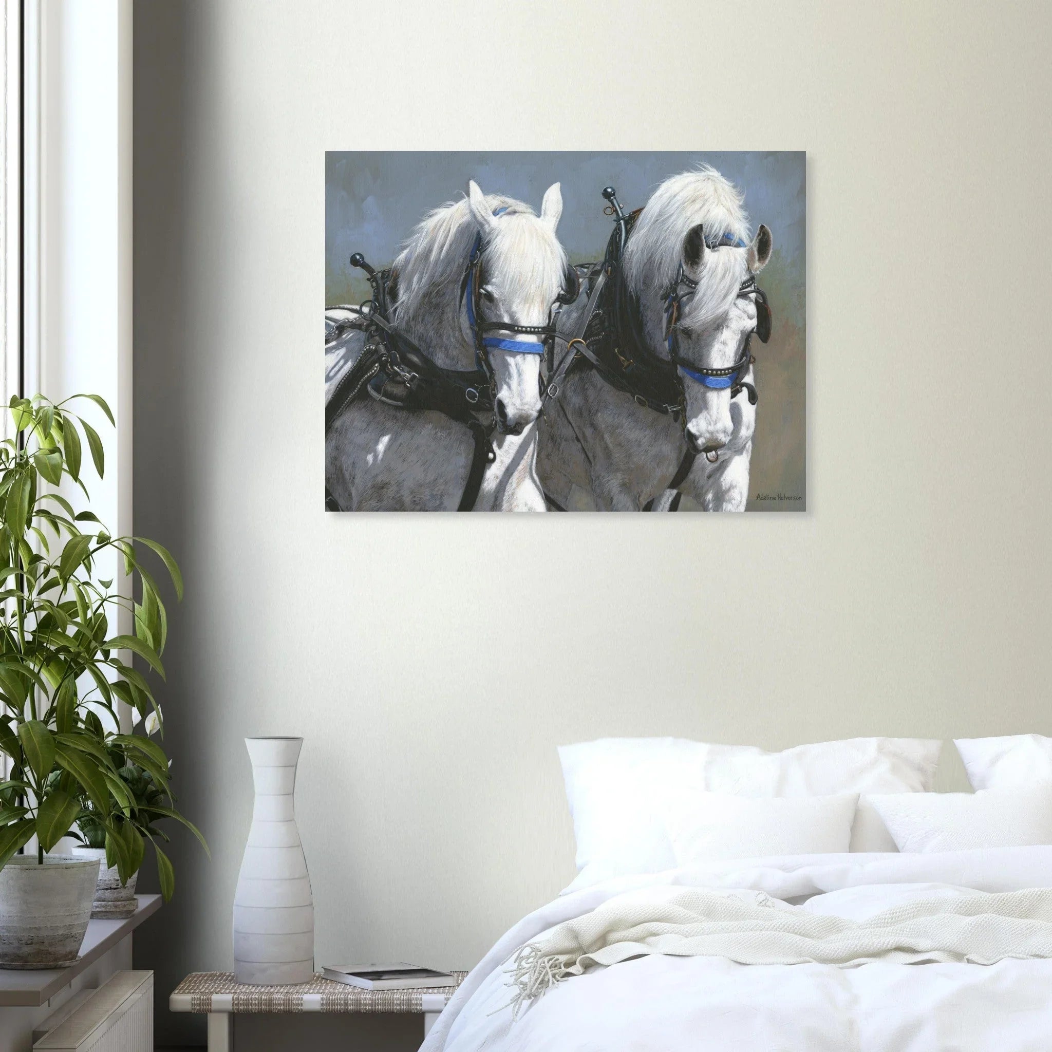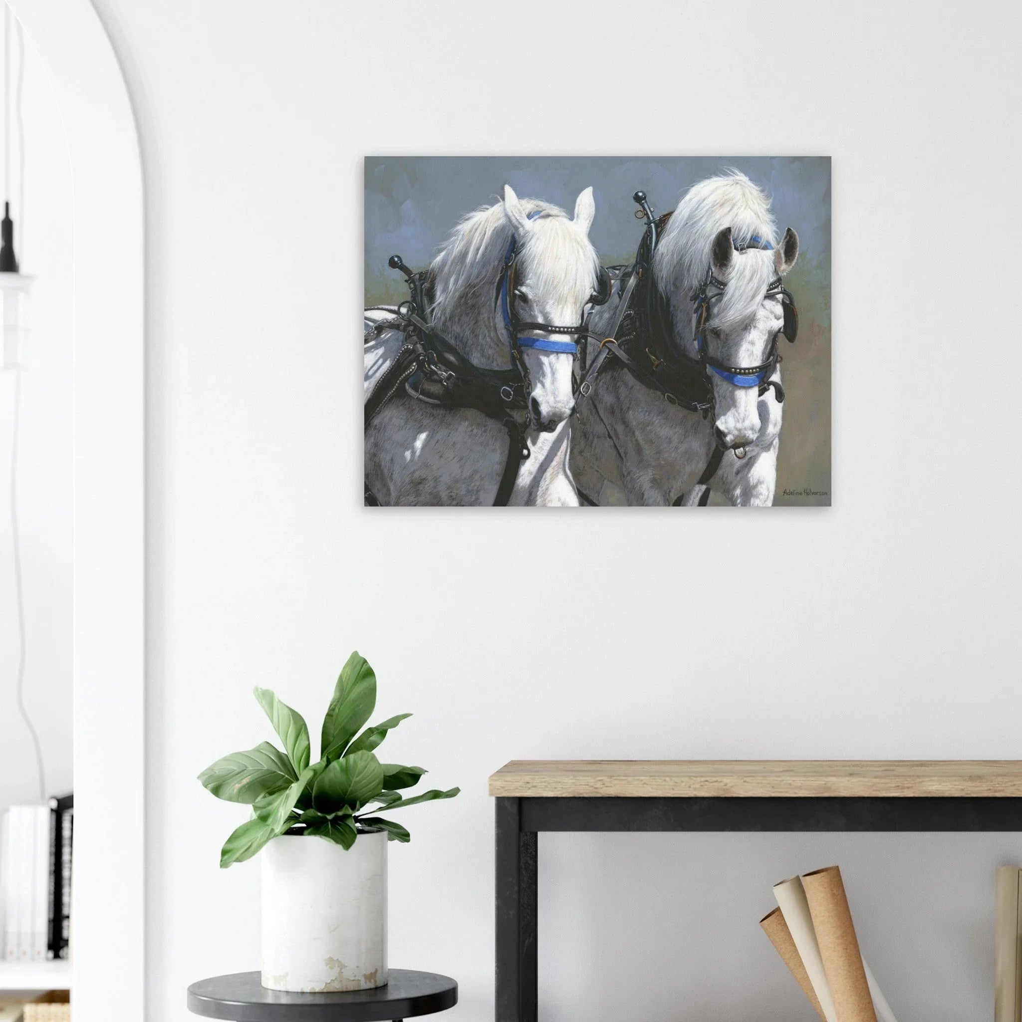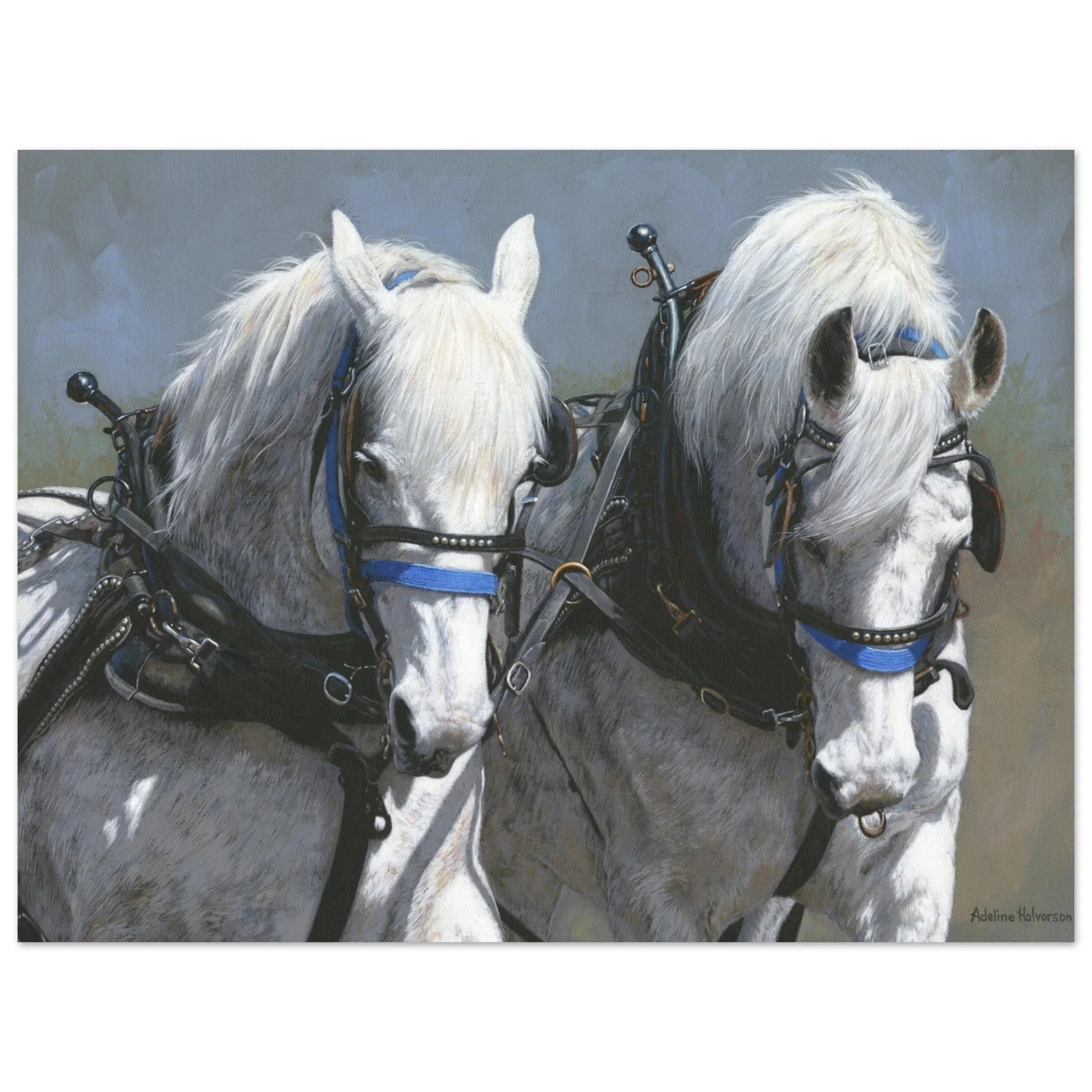 Celebrate the beauty and strength of equine majesty with our Power and Grace print featuring a stunning draft horse team pulling in harness. This artwork captures the essence of power and grace, making it a perfect addition to your collection.