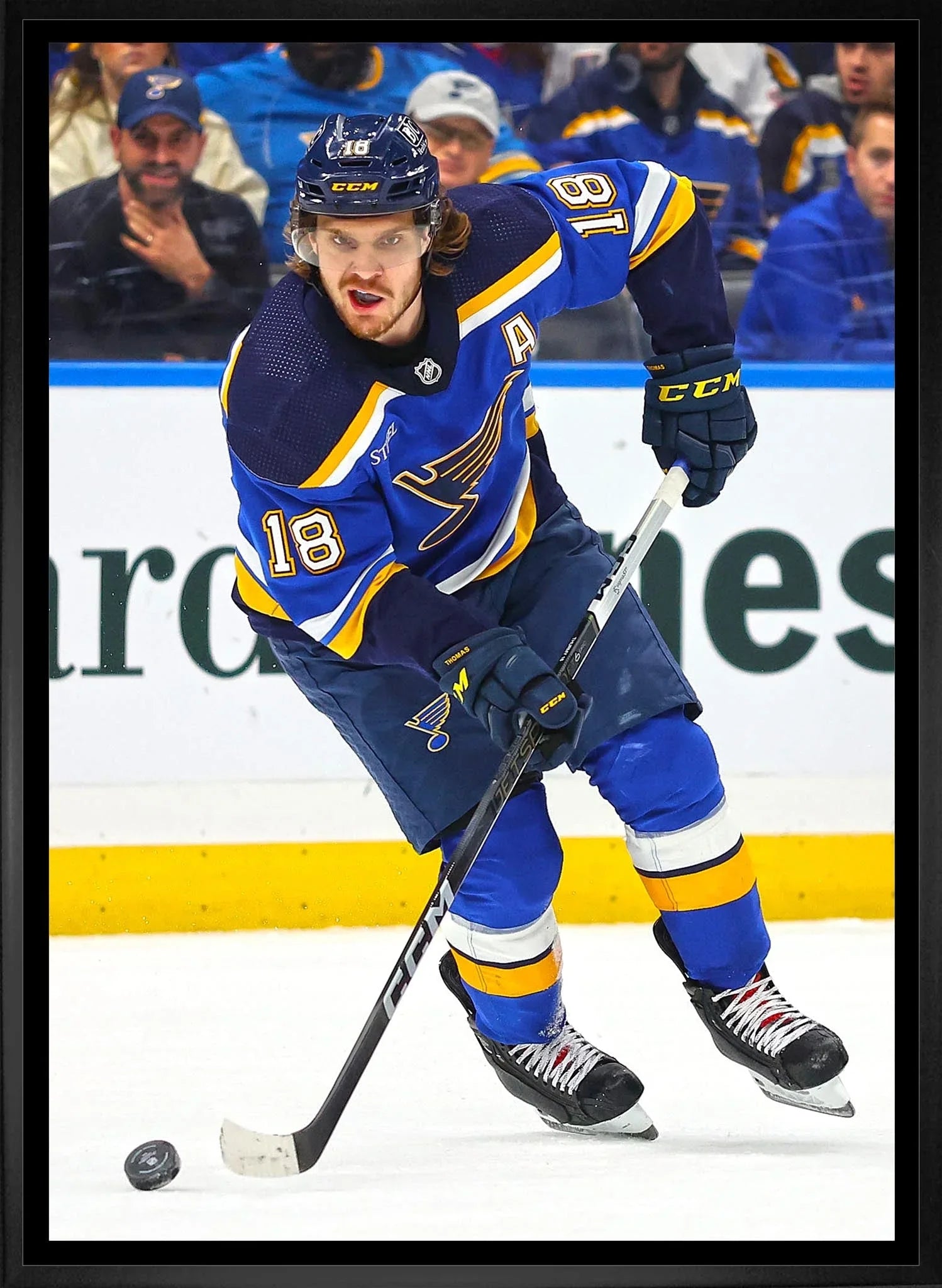 This image of Robert Thomas is printed on high quality art canvas and then professionally stretched and framed. This canvas is officially licensed by the National Hockey League (NHL) and National Hockey League Players Association (NHLPA). Made in Canada.. Finished Size: 22.5 x 31.5"