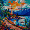 In this serene scene, a majestic lighthouse stands tall beside a tranquil passage, guiding seafarers home. The trail leading to the lighthouse is framed by vibrant wildflowers and towering pine trees, with the striking silhouette of blue mountains rising in the background. The artwork evokes a sense of peace, wonder, and reverence for these historic beacons of safety.