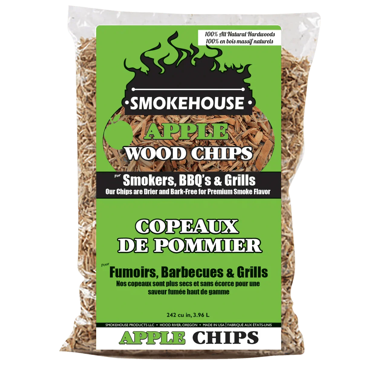 Our Apple wood chips produce a mildly sweet smoke that is ideal for any cut of meat, including pork, beef and poultry. Its sweet flavor can also be used to enhance the flavor of nearly any food and has grown to be the favorite of many professional BBQ enthusiasts. All bags are 242 cu.in., 3.96 L in size.
