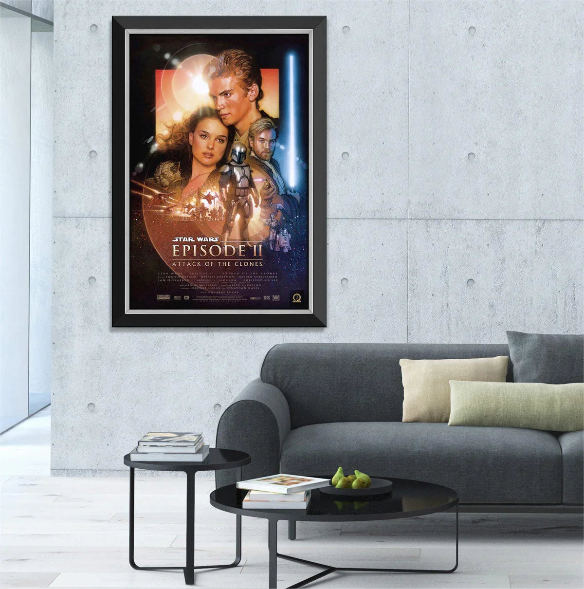 This is a framed textured canvas print of the Star Wars Episode II Attack Of The Clones Movie Poster. A must have for Star Wars Fans and cinematic collectors. Comes museum framed and measures 33.5 x 23.5 inches.