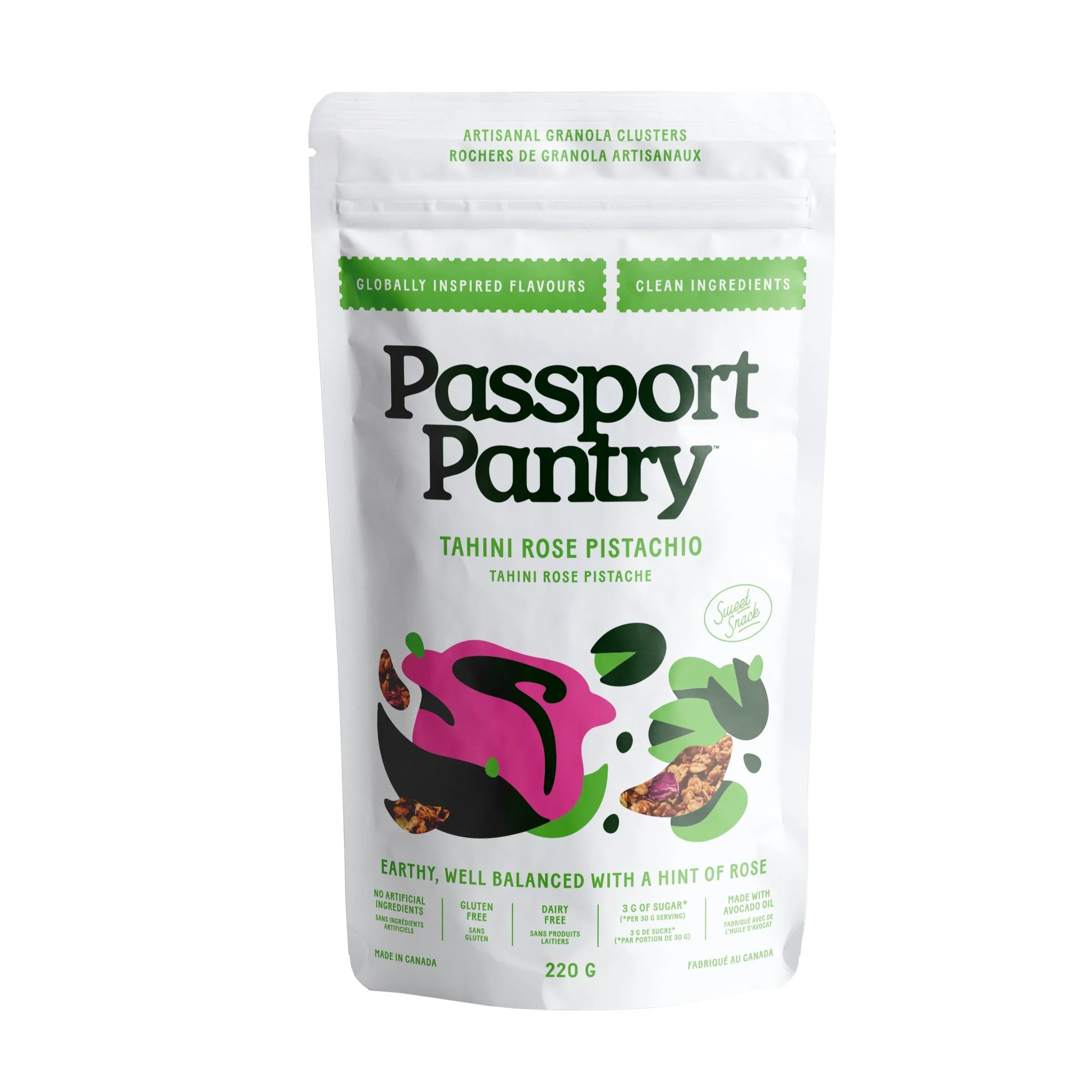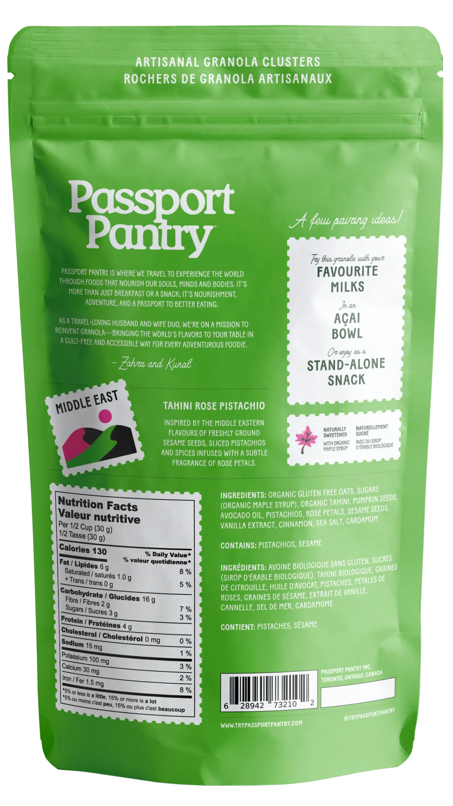INGREDIENTS: Organic Gluten Free Oats, Sugars (Organic Maple Syrup), Organic Tahini, Pumpkin Seeds, Avocado Oil, Pistachios, Rose Petals, Sesame Seeds, Vanilla Extract, Cinnamon, Sea Salt, Cardamom