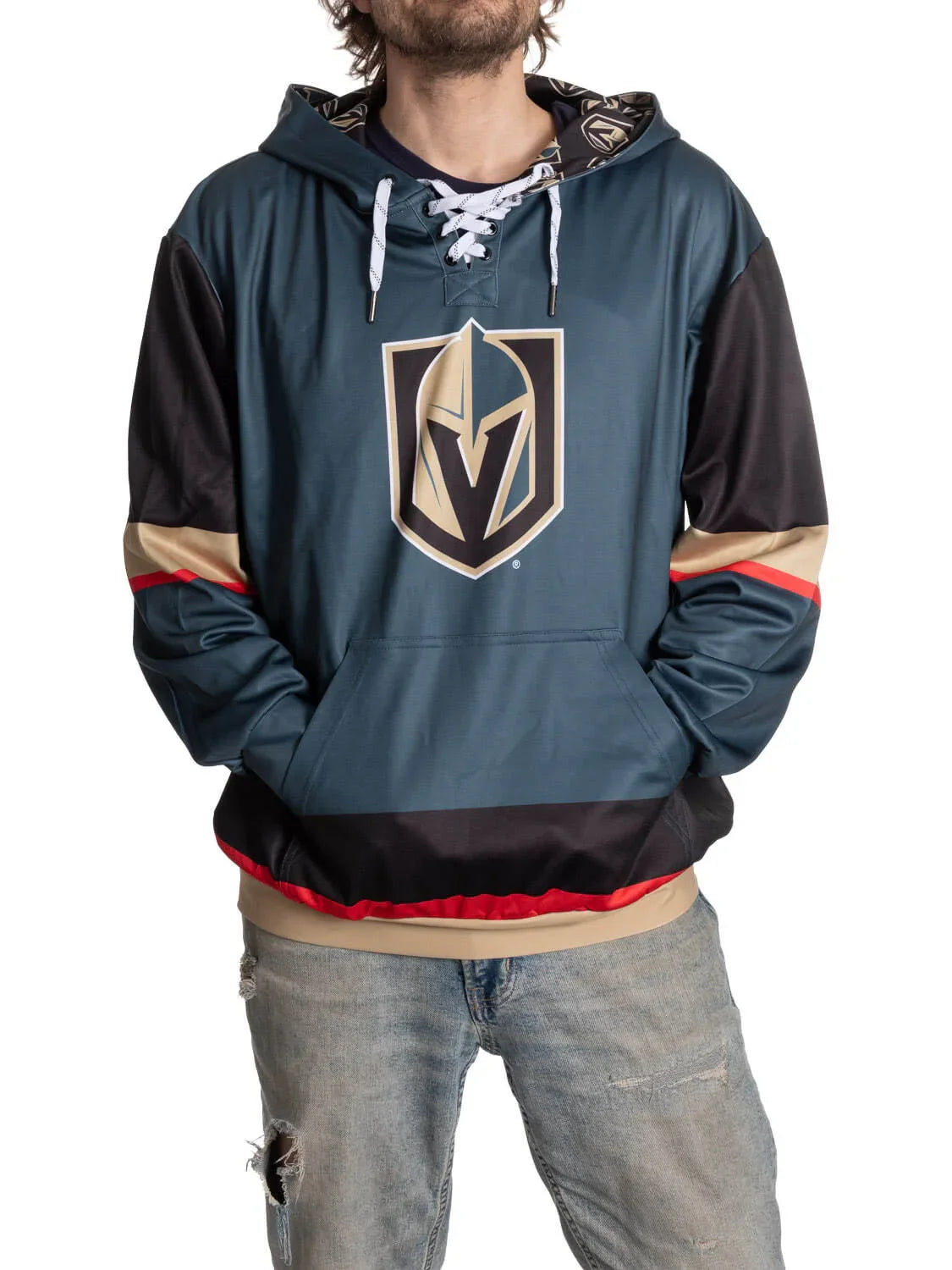 Lace up in style this season with our new Official Licensed NHL Vegas Golden Knights Hockey Lace Hoodie. Styled in Vegas Golden Knights team colours, this hoodie shows off your Golden Knights pride in style!