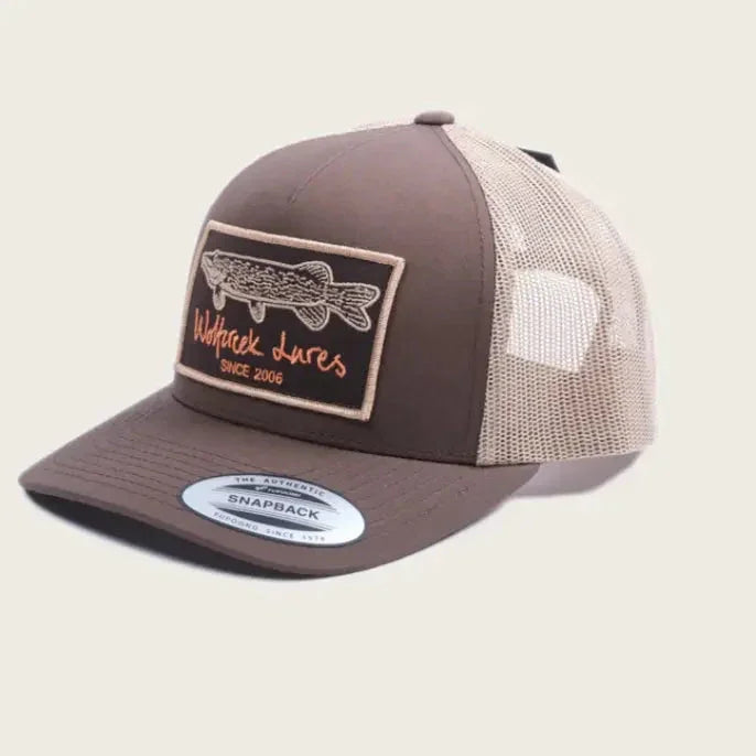 Classic Yupoong Retro Trucker 2-tone Snapback in Brown/Khaki with embroidered Pike Logo Patch.