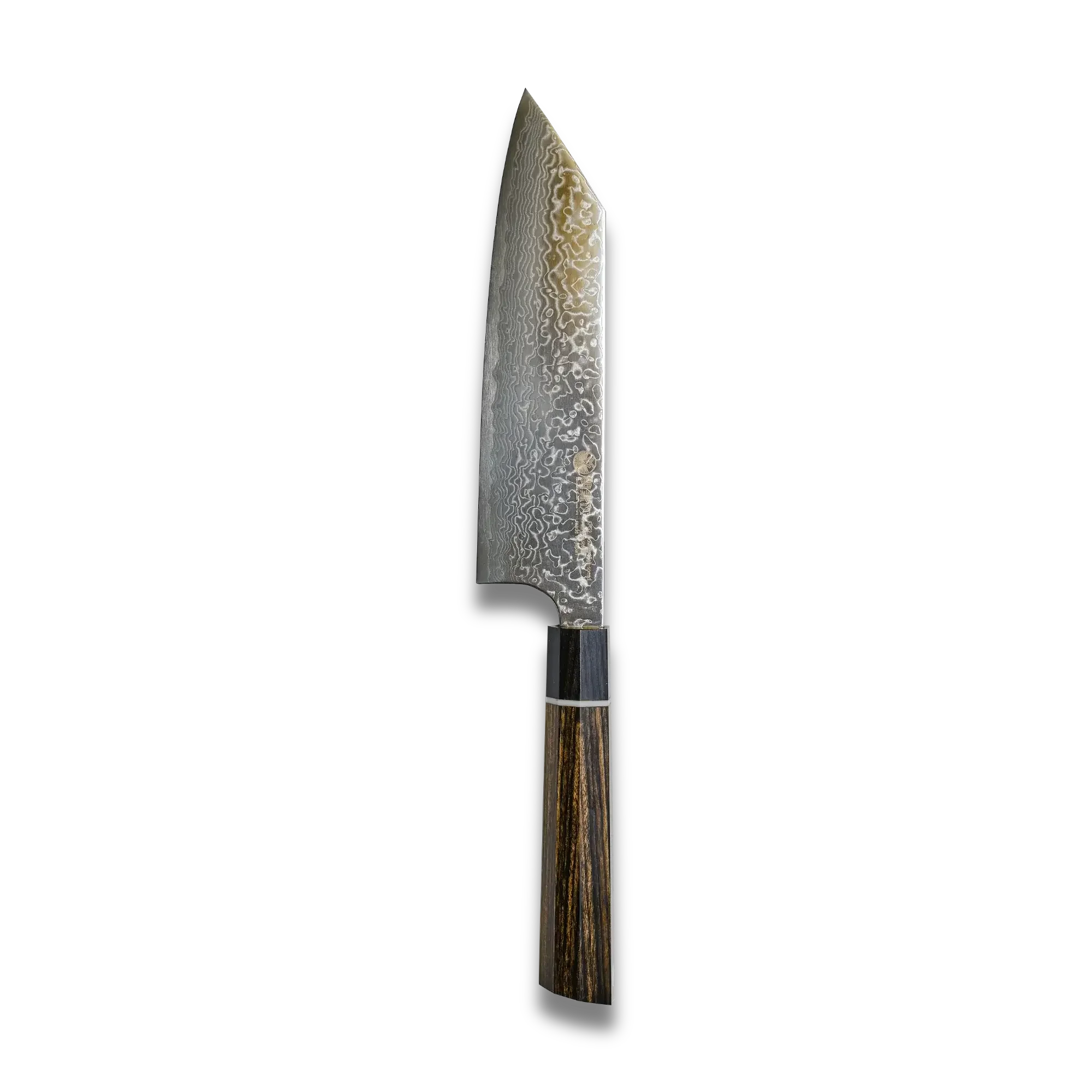 Experience culinary finesse with the Kiritsuke Santoku Knife's San Mai construction, featuring a precisely honed double-edged blade with a 50/50 grind. The core steel, R2/SG2, undergoes meticulous heat treatment, reaching an impressive hardness of 62-63 HRC for unparalleled edge retention. Adorned with a captivating Damascus finish, the hand-sharpened blade seamlessly blends beauty with functionality.